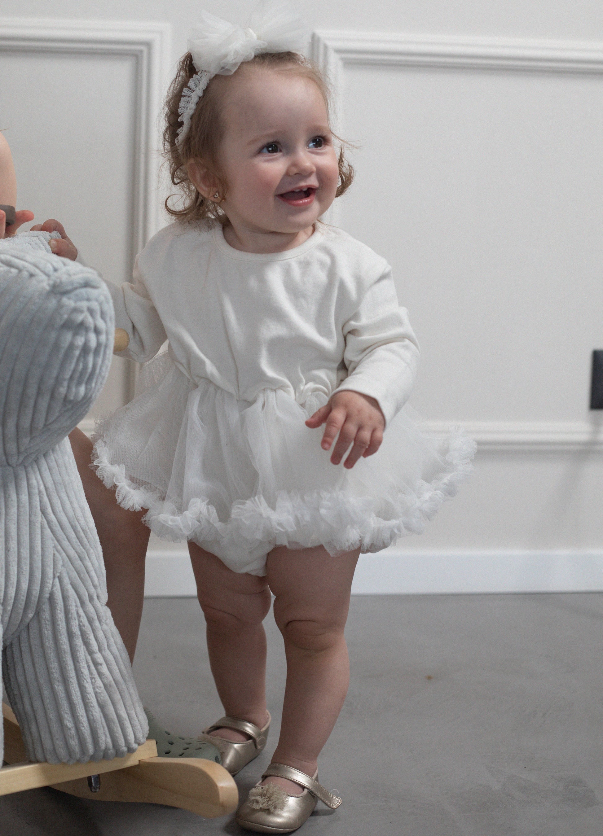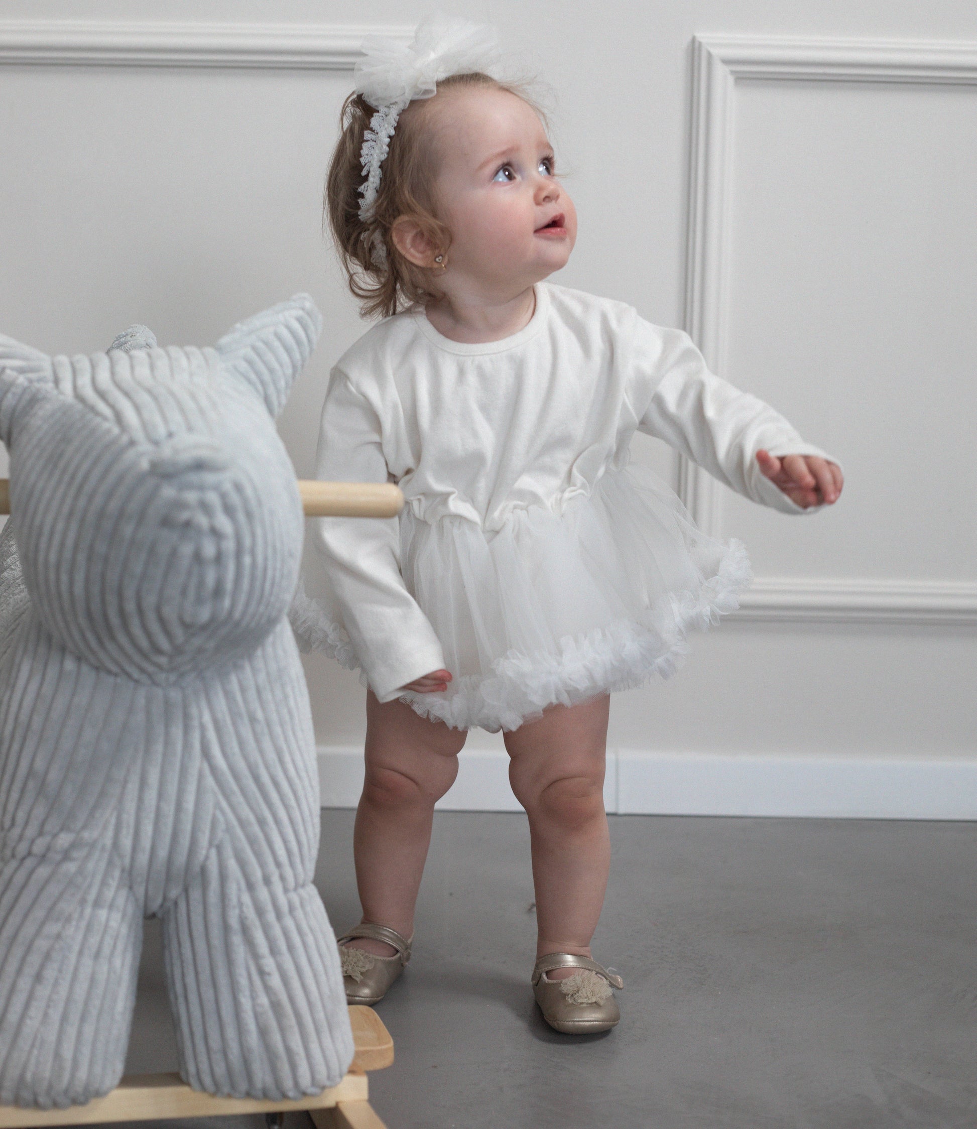 Cu un body din bumbac moale și o fustiță tutu jucausă, micuța ta va fi la fel de confortabilă precum este adorabilă! Un amestec de dulceață și practicitate pentru fiecare zi plină de aventură!