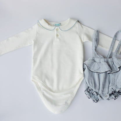Îmbracă-ți bebelușul în stil marinăresc cu body-ul nostru din bumbac, cusut cu detalii delicate. Ideal pentru orice ocazie specială. Descoperă confortul și farmecul cu acest body adorabil!